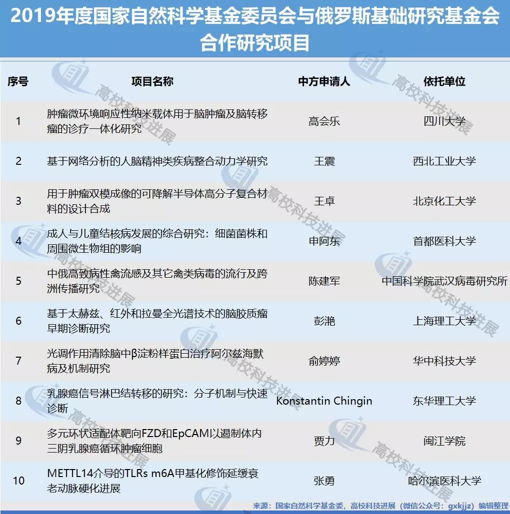 在獲批的中俄合作研究項目中,四川大學、西北工業大學、北京化工大學、首都醫科大學、上海理工大學、華中科技大學、東華理工大學、閩江學院、哈爾濱醫科大學等9所高校分別有1個申報項目獲得批準;中國科學院研究單位獲得批準項目1個。按照資助強度為不超過100萬元/項的標準,高校本次共獲得國家自然科學基金委經費資助預計將達到900萬元。