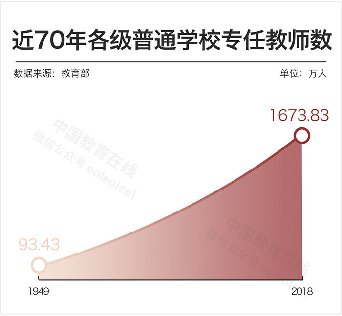 近些年來,我國教師隊伍不斷壯大。根據教育部公布的數據顯示,全國現有各級各類專任教師1673.83萬人,比1949年的94.43萬人增長近17倍,這個龐大的職業群體支撐起世界上最大規模的教育體系。