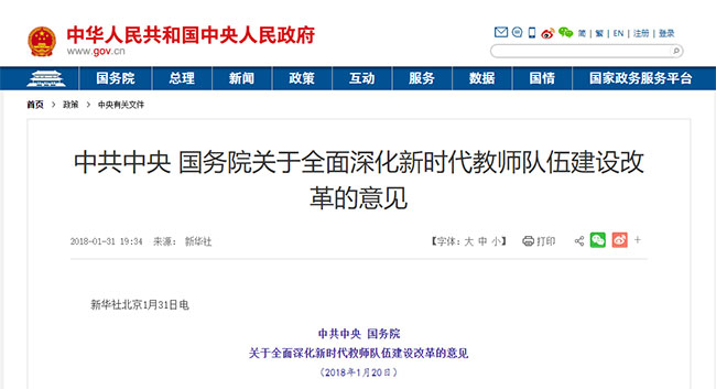 2018年1月20日,中共中央、國務院印發《關于全面深化新時代教師隊伍建設改革的意見》,提出要“不斷提高地位待遇,真正讓教師成為令人羨慕的職業”。