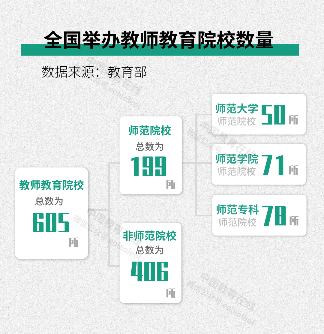 教師是教育事業改革發展第一資源,師范教育是培養教師的主陣地、主渠道,師范強則教師強,教師強則教育強。根據教育部2019年公布的數據顯示,全國共有舉辦教師教育院校605所,其中高等師范院校199所,舉辦師范教育的非師范院校406所。