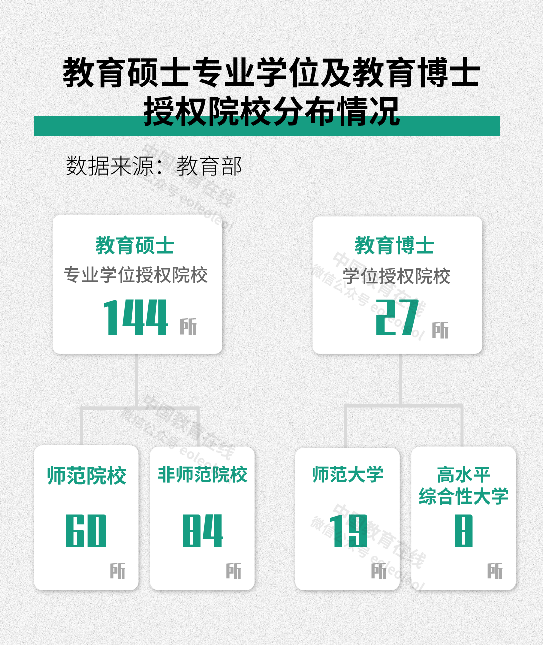 我國具有教育碩士專業學位授權院校144所,具有教育博士學位授權院校27所。