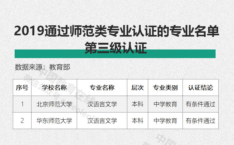 教育部公布的2019年通過普通高等學校師范類專業認證的專業名單中,北京師范大學及華東師范大學的漢語言文學專業分別通過第三級專業認證。(備注:通過第三級認證的專業,在認證結論有效期內入學的師范生,可由高校自行組織中小學教師資格考試筆試和面試工作。)