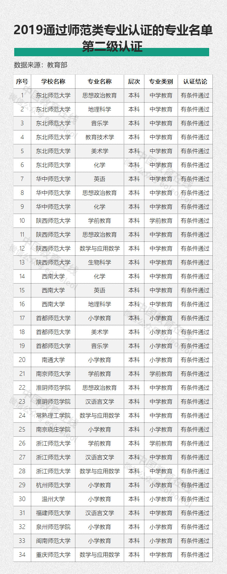 東北師范大學、華中師范大學等17所高校的34個專業通過第二級專業認證。(備注:通過第二級認證的專業,在認證結論有效期內入學的師范生,可由高校自行組織中小學教師資格考試面試工作。)