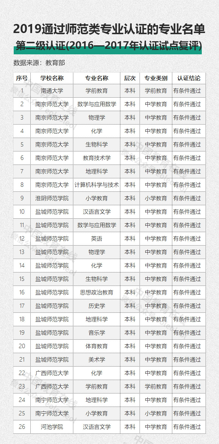 另外,江蘇、廣西2016—2017年通過師范類專業認證試點的專業中,共26個專業通過第二級專業認證。