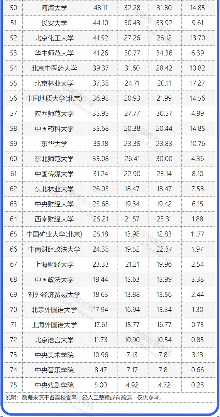 說明:本文統計中,華北電力大學經費為北京校區和保定校區合計,哈爾濱工業大學、北京航空航天大學、西北工業大學等工信部直屬高校以及國科大、中科大等中國科學院直屬高校以及其他部委院校不在本文的統計范圍之內。