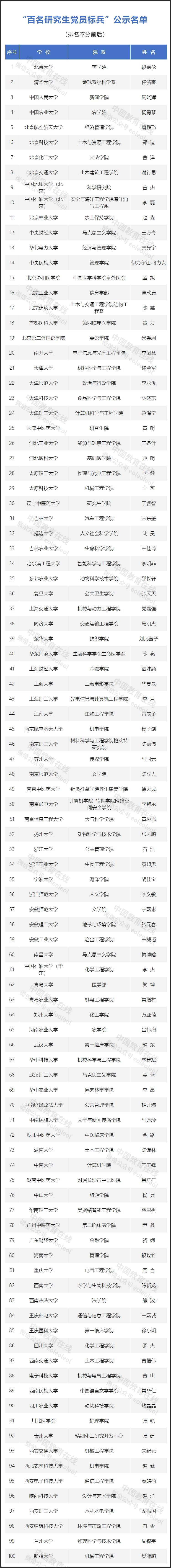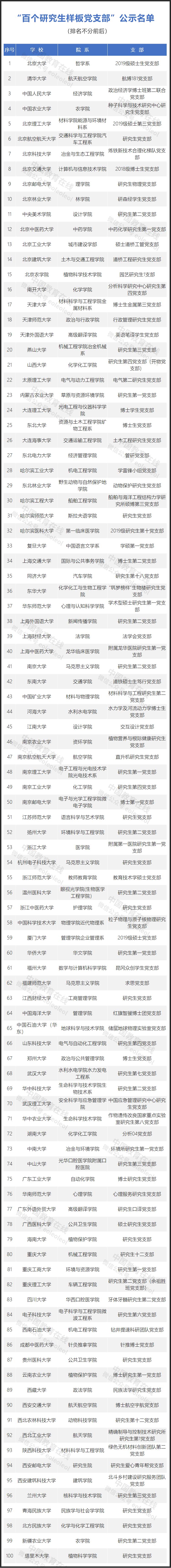 根據《關于開展第二批全國高校“百個研究生樣板黨支部”和“百名研究生黨員標兵”創建工作的通知》(教思政廳函〔2020〕14號)安排和評審工作方案,經組織推薦、通訊評審、集中會審,遴選產生了100個研究生樣板黨支部,100名研究生黨員標兵。公示期自2021年7月23日至29日。