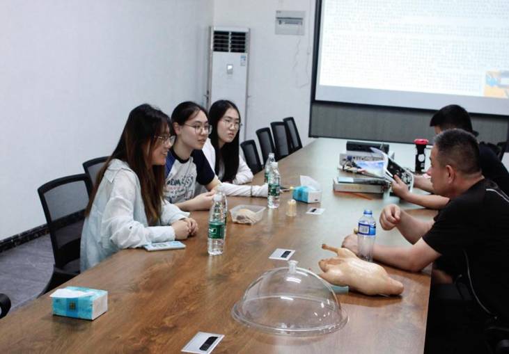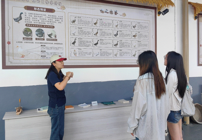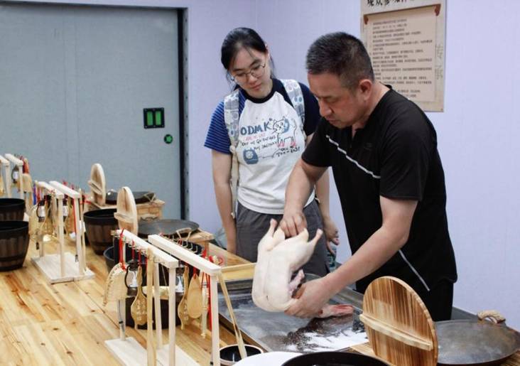 非遺工坊負責人馬曉宇、非遺傳承人馬兆凱為實踐團成員講解南京板鴨、鹽水鴨的相關知識。 趙悅彤供圖
