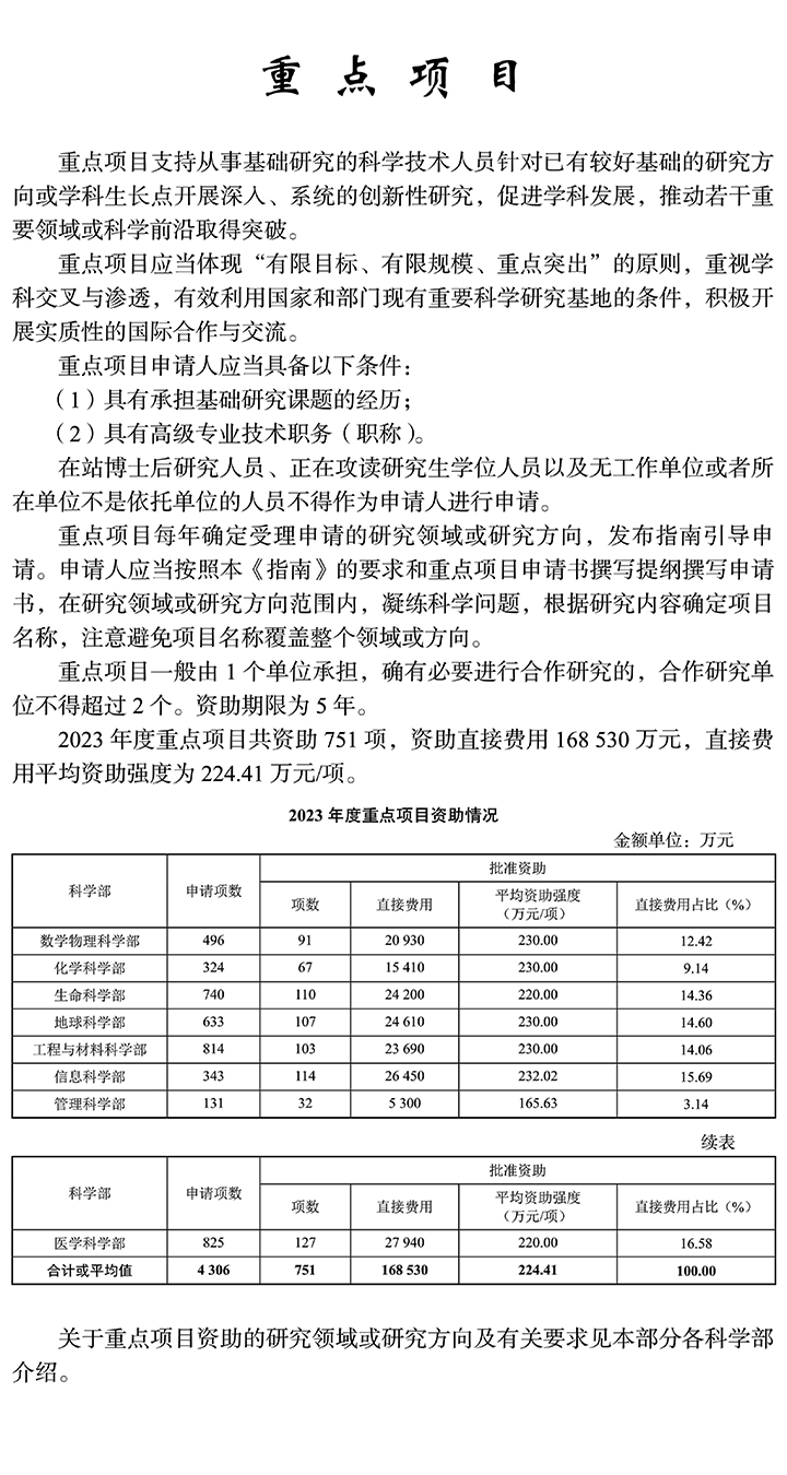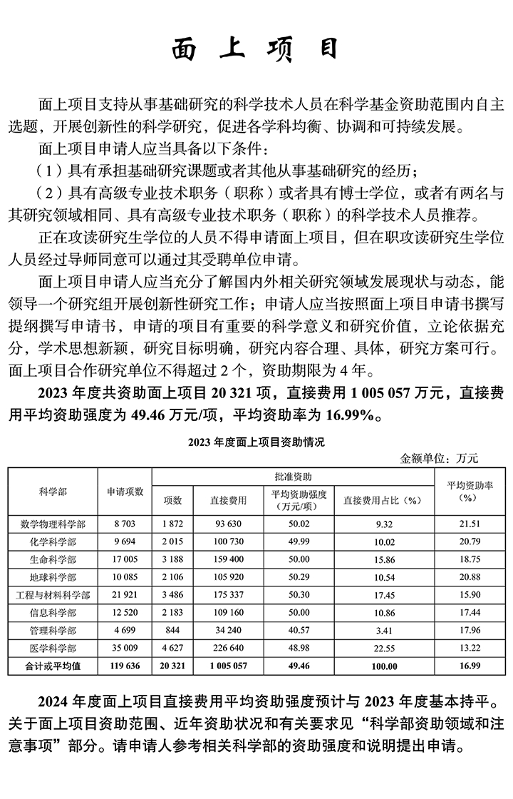 申請人在申請 2024 年度科學基金項目之前,應當認真閱讀《國家自然科學基金條例》(以下簡稱《條例》)、本《指南》、相關類型項目管理辦法、《國家自然科學基金資助項目資金管理辦法》,以及與申請有關的通知、通告等。現行項目管理辦法與《條例》和本《指南》有沖突的,以《條例》和本《指南》為準。申請規定包括申請條件與材料、限項申請規定、預算編報要求、科研誠信和科技倫理要求、依托單位職責和責任追究等。