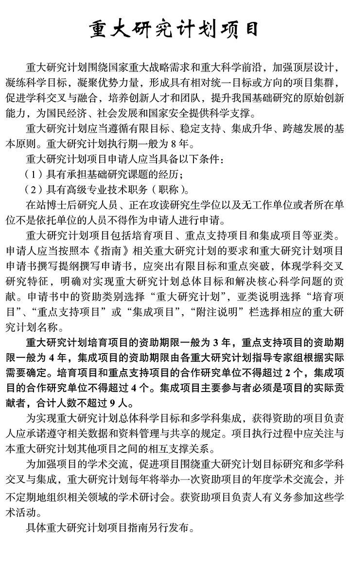 2. 上年度獲得面上項目、重點項目、重大項目、重大研究計劃項目(不包括集成項目和戰略研究項目)、聯合基金項目(指同一名稱聯合基金)、地區科學基金項目資助的項目負責人,本年度不得作為申請人申請同類型項目。