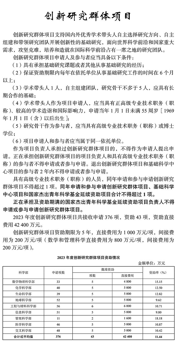 具有高級專業技術職務(職稱)的人員,同年申請和參與申請創新研究群體項目、基礎科學中心項目和國家杰出青年科學基金延續資助項目,合計限 1 項。