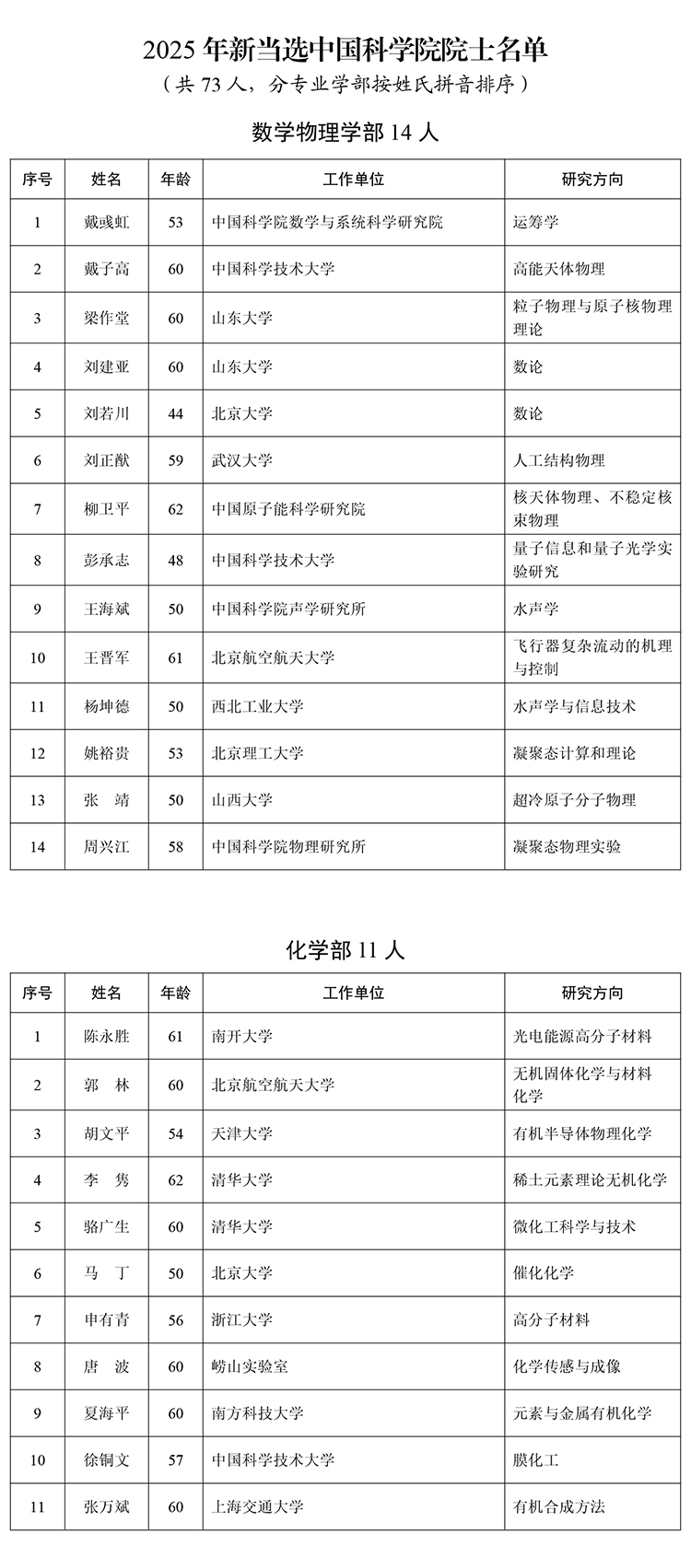 根據《中國科學院院士章程》《中國科學院院士增選工作實施辦法(試行)》《中國科學院外籍院士選舉辦法》等規定,2025年中國科學院選舉產生了73名中國科學院院士和27名中國科學院外籍院士。