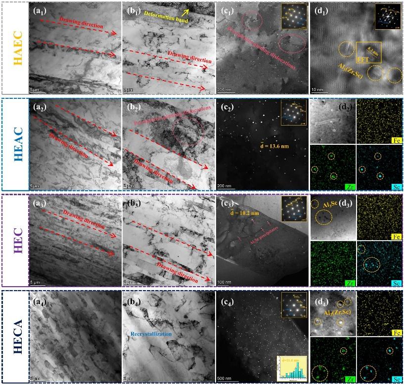 昆明理工大學黎振華團隊近年來聚焦綠色鋁、鈦等云南特色優勢產業,以服務國家特別是本土產業發展需求為導向,與北京航空航天大學馬朝利、肖文龍團隊合作,系統考察了加工路徑對鋁-鋯-鈧合金微觀組織與性能的影響,獲得了各工藝環節對合金組織、強度和導電率影響的定量關系。結果表明,通過快速凝固-熱變形-時效-冷拔路徑,充分利用細晶強化、析出強化、位錯強化和熱變形過程中鈧原子的動態析出,可獲得強度、導電率及耐熱性良好匹配的鋁-鋯-鈧合金導線。