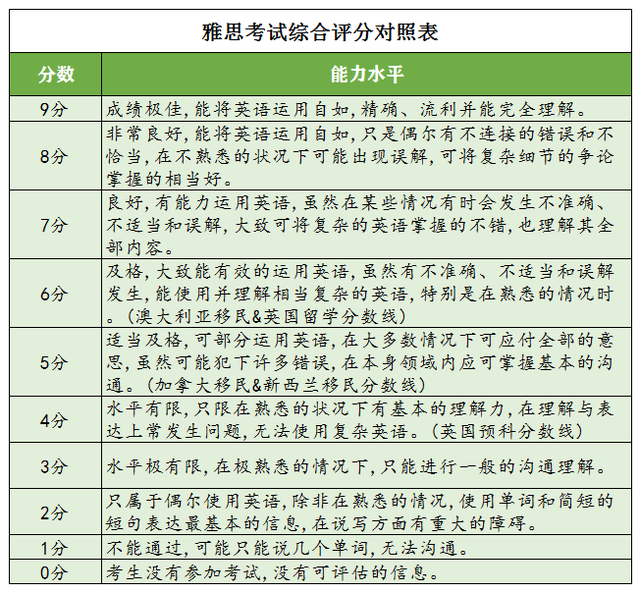 以上就是關于“雅思成績對照表”的全部內容,評分的標準已經很詳細了,相信同學們已有所了解,更多內容請繼續關注教育在線。