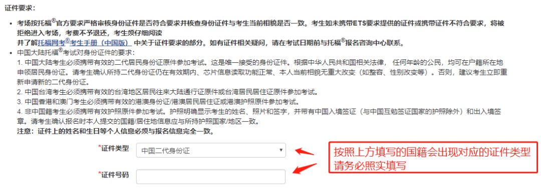 選擇“證件類型”時,按照上方填寫的國籍會出現對應的證件類型,請務必照實填寫!