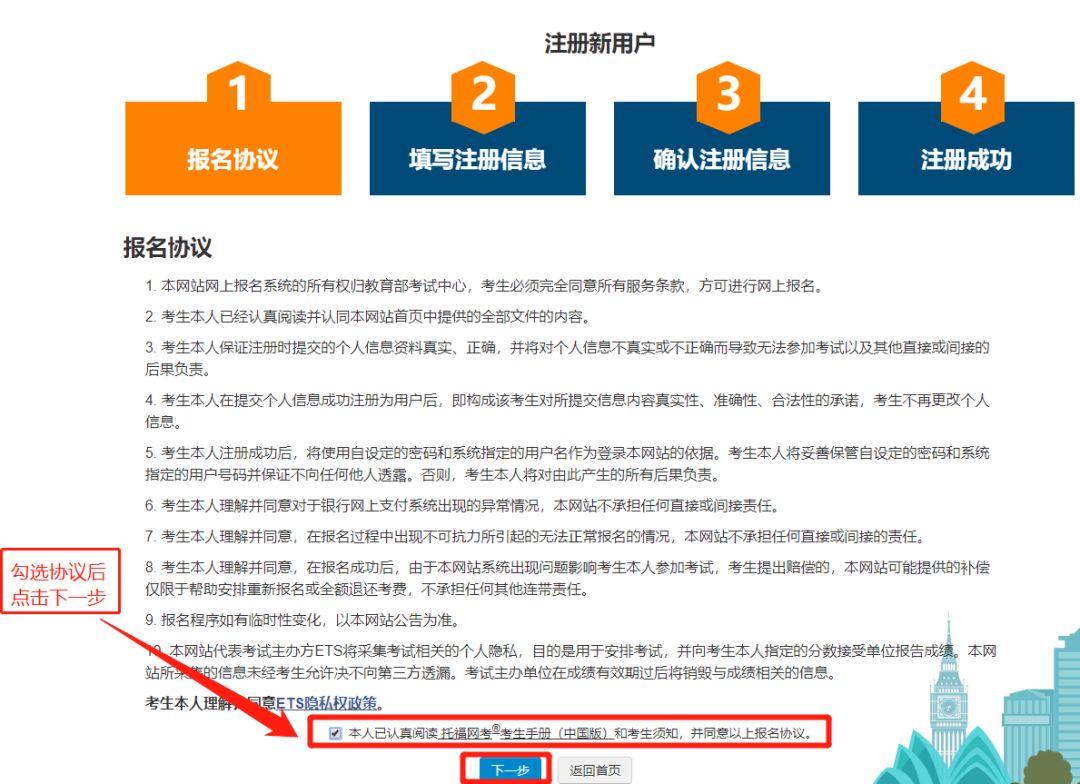注冊賬號:需要簽署報名協議,勾選協議后點擊“下一步”。