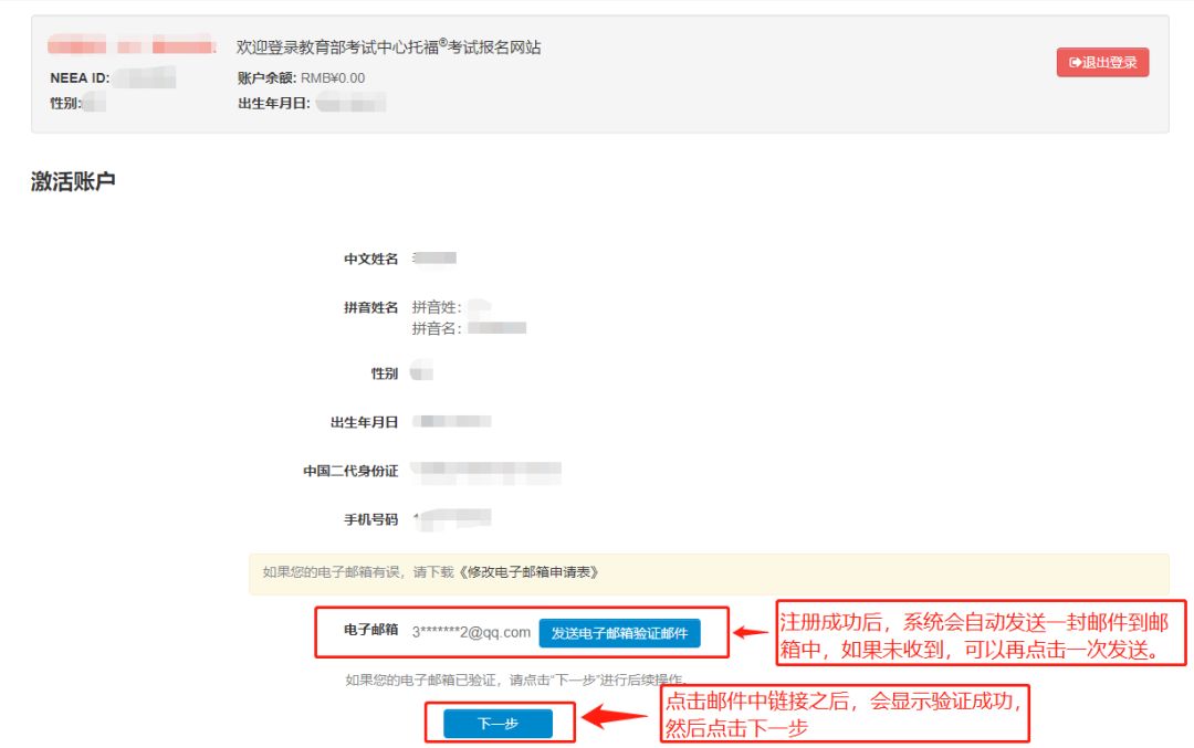 首次登陸最新版的NEEA托福報名官網時,都需要進行郵箱和手機號的雙重驗證,以激活賬戶。