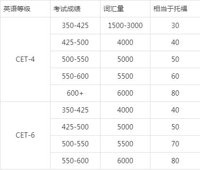 托福和英語等級確實側重點不同,但既然同為英語能力測試,那么肯定有個難易區分的,就像英語六級難于四級一樣,那么接下來我們看下托福成績與英語四六級成績的對比。