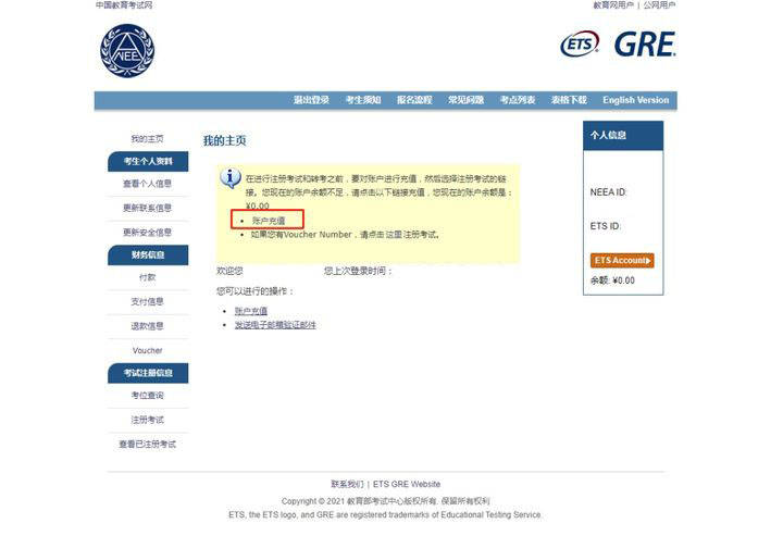 第六步,充值報名。登錄進去之后點擊我的主頁,進行賬戶充值,充值好之后就可以選擇具體的考位來付費報名啦。